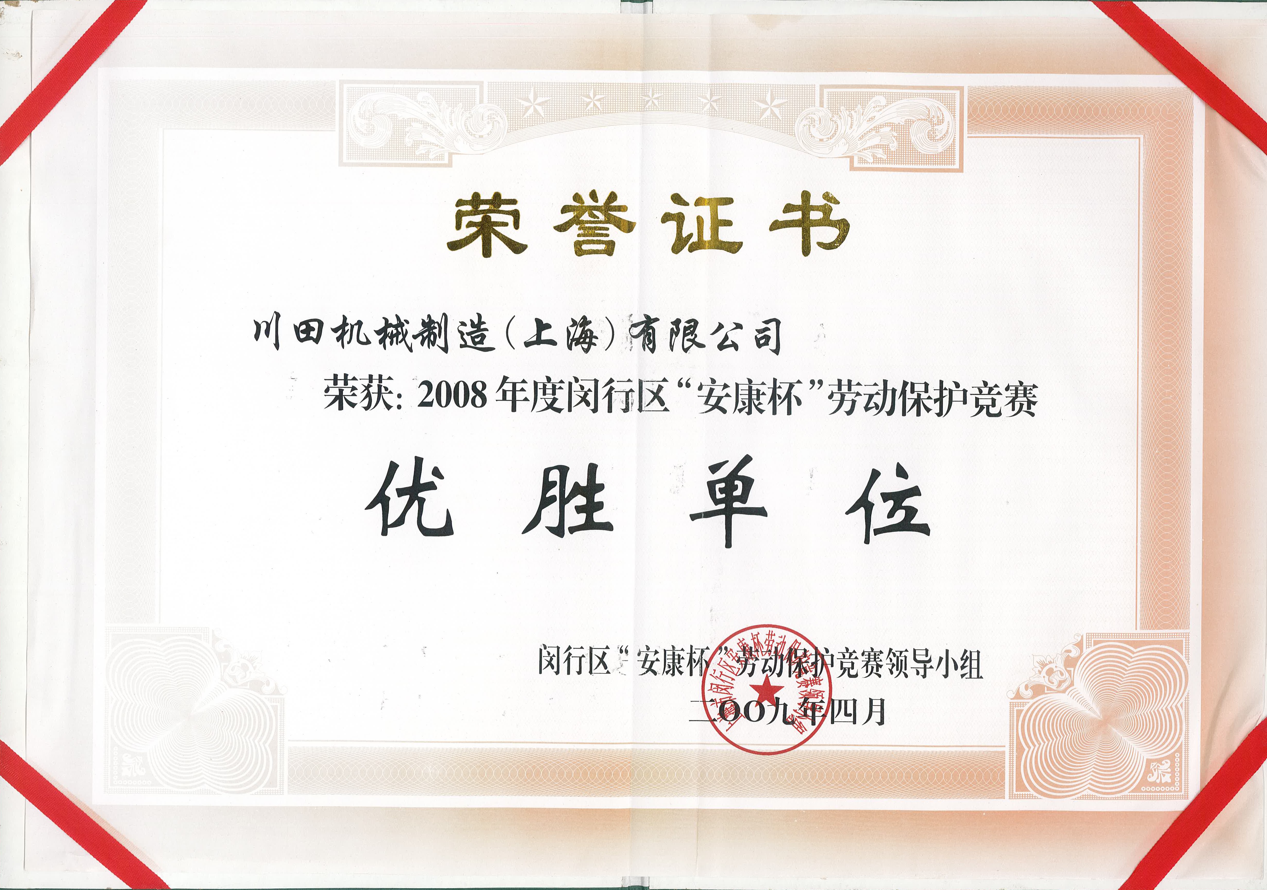 2008年度上海市赤十字栄譽証書-川田機械